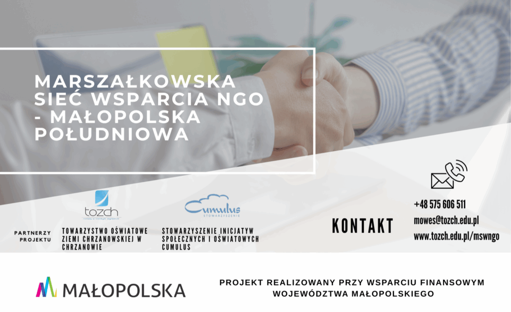 Szanowni Państwo, zapraszamy do udziału w projekcie Marszałkowska Sieć Wsparcia NGO – Małopolska Południowa, realizowanym przy wsparciu finansowym Województwa Małopolskiego. Projekt skierowany jest do fundacji, stowarzyszeń, kół gospodyń wiejskich, OSP, klubów sportowych, spółdzielni socjalnych, spółek non-profit oraz innych organizacji działających w sferze społecznej. 📅 Najbliższe wydarzenia: Miejsce: Centrum Kultury i Promocji w Krościenku nad Dunajcem, ul. Rynek 34, 34-450 Krościenko nad Dunajcem Miejsce: ZAZ OD_NOWA, ul. Ludźmierska 32, 34-400 Nowy Targ Oferujemy bezpłatne wsparcie, w tym: Dodatkowo oferujemy indywidualne doradztwo (marketingowe, prawne, księgowe, finansowe) – terminy ustalane indywidualnie. ℹ Szczegółowe informacje oraz formularze zgłoszeniowe dostępne są na stronie: www.tozch.edu.pl/mswngo. Telefon kontaktowy 660-228-860. Link do zapisu: https://docs.google.com/forms/d/e/1FAIpQLSfi7ERyQiMwrIQ3ir9Ozd2vsxRKp8OWAyGvKtQqz-navjtT7A/viewform Serdecznie zachęcamy do udziału – to doskonała okazja, aby rozwijać kompetencje i wzmocnić potencjał Państwa organizacji!